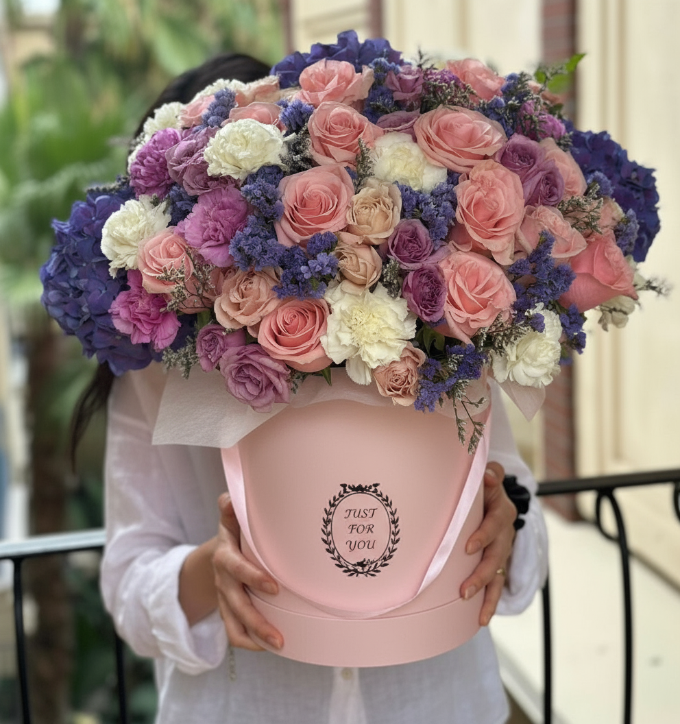 Flower Box arranged with exquisite flowers such as: Premium white and pink Roses, Spray roses, Carnations, Hydrangea and Greeny Fillers.