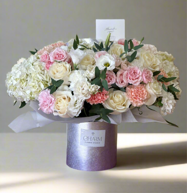 Flower box arranged with exquisite flowers such as: Premium Roses, Spring Roses, Carnations, Hydrangea, Beautiful Purple blossoms and Greeny fillers.