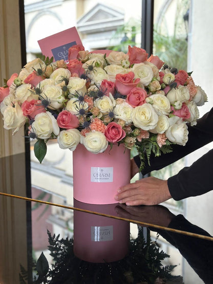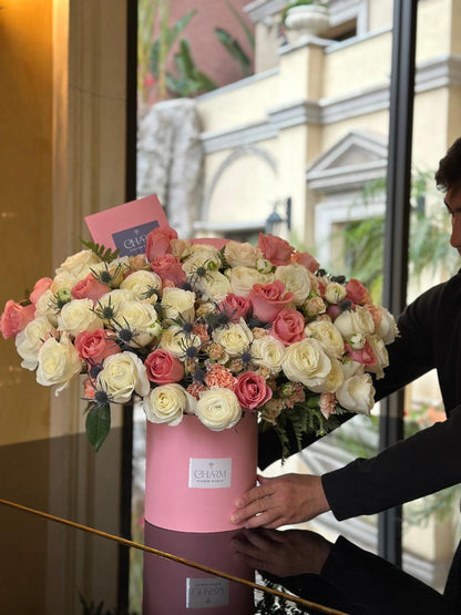 An unforgettable floral statement, Deluxe Rose Hatbox features a lush blend of cream, blush, and coral roses paired with elegant blue thistle accents.