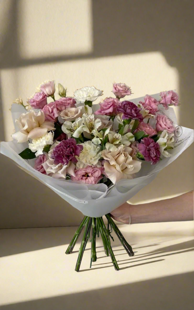 This lavender and blush bouquet is full of gentle charm, featuring purple roses, stock flowers, white carnations, and pink spray roses. Elegant and dreamy.