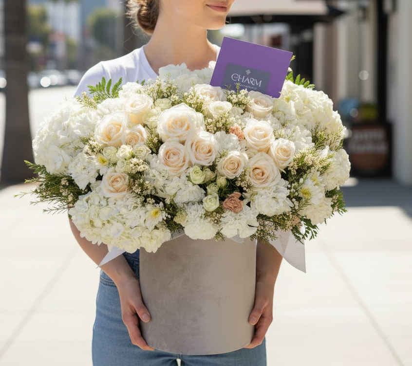Designed with creamy blush roses, white hydrangeas, and accented with seasonal textural blooms, this arrangement blends texture, softness, and romance in perfect harmony.