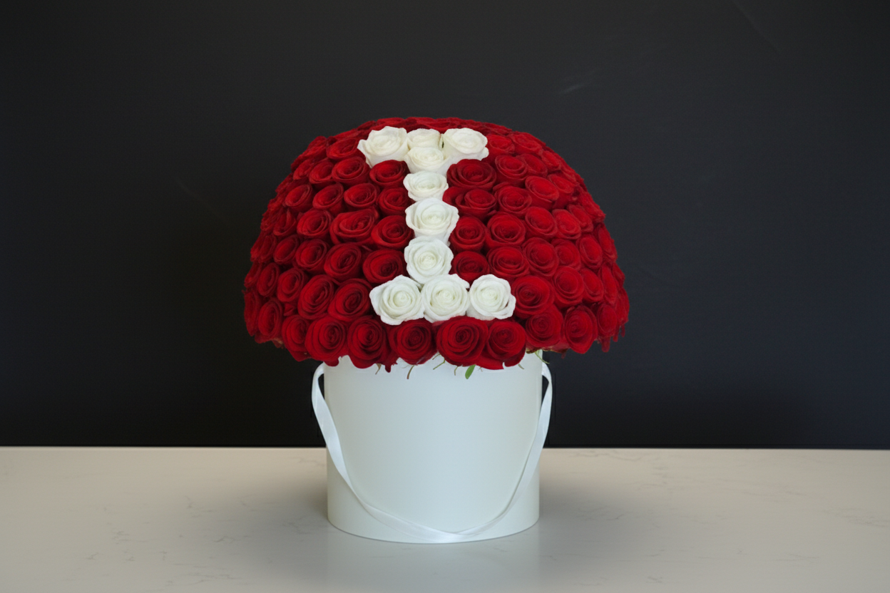 This elegant arrangement features premium fresh roses, meticulously handcrafted to form a custom letter of your choice, set against a rich backdrop of deep red roses.