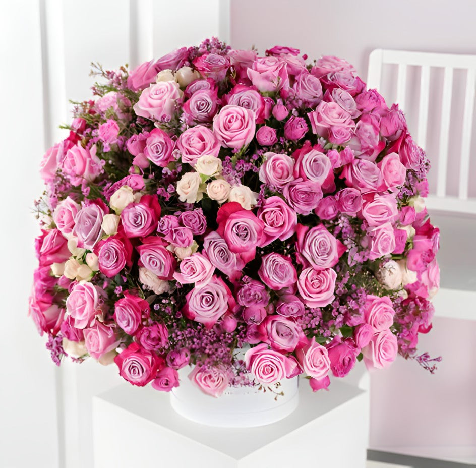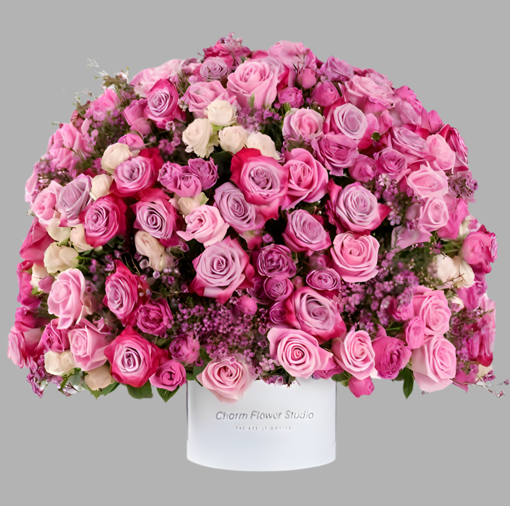 A show-stopping bloom box overflowing with 100 stunning rose stems in vibrant pink tones — from blush to hot pink. Accented with seasonal textures and designed in a round hat box, this arrangement is perfect for moments that deserve to be unforgettable.