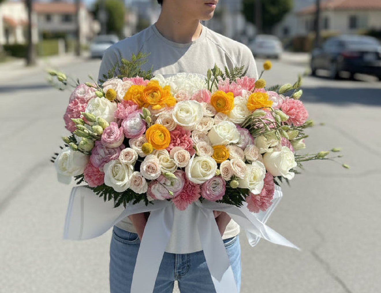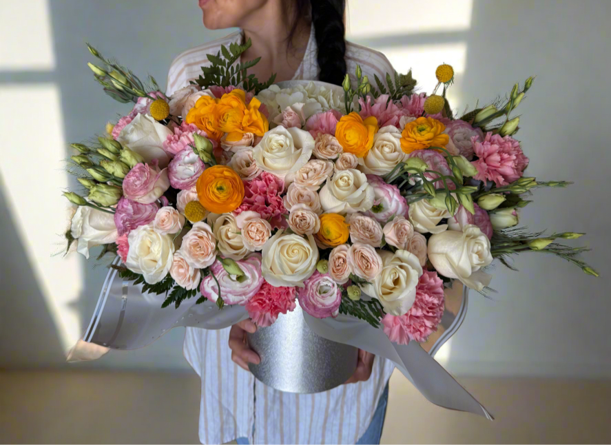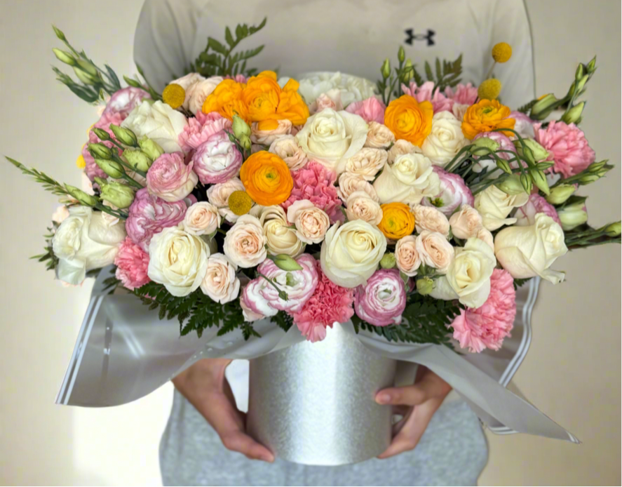 Crafted with premium roses, ranunculus, and spray roses in soft peach, buttery yellow, and ivory hues, Sunset Reverie exudes calm, light, and timeless beauty.