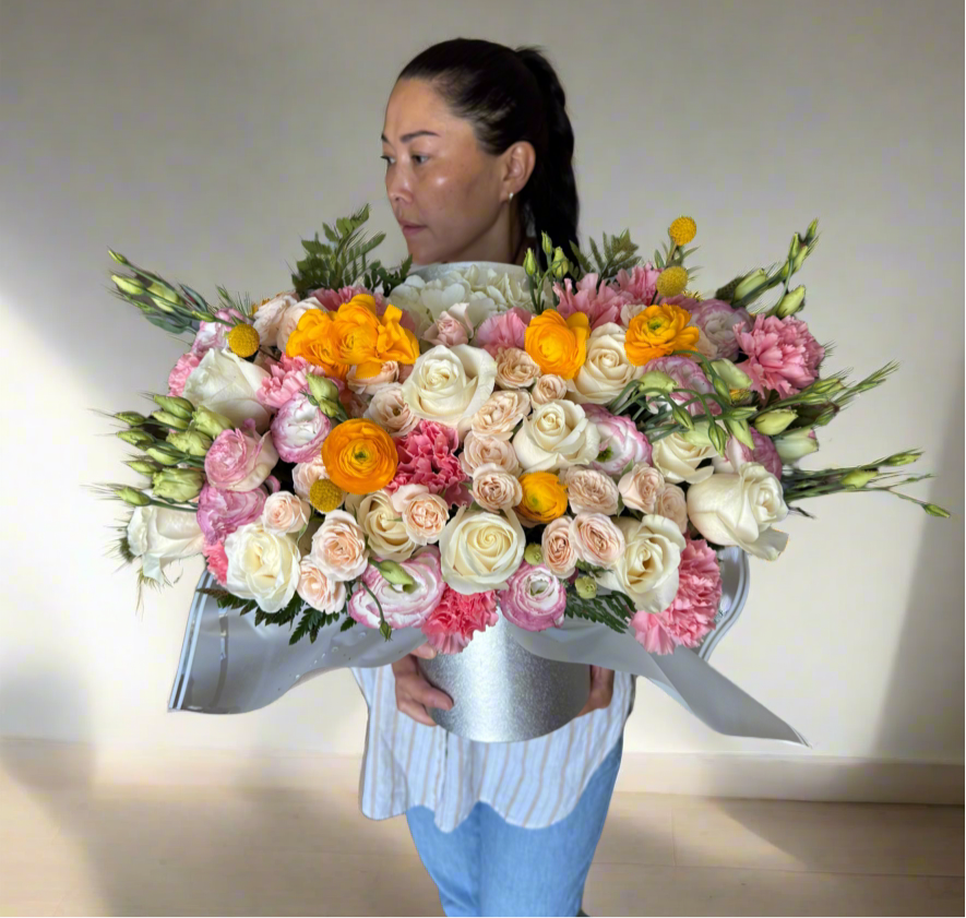 Please note: Every arrangement is made by hand with seasonal flowers. While we always follow the intended design and palette, substitutions may occur based on availability. Box color may also vary.