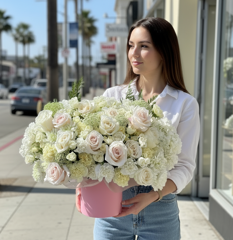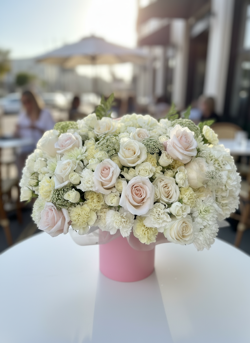 Flower box arranged with exquisite flowers such as: Premium Roses, Spring Roses, Hydrangea, Beautiful blossoms and Greeny fillers.